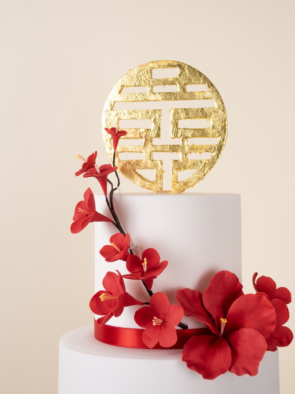 A contemporary Chinese inspired three tier wedding cake, inspired by the couple’s heritage and vision. Finished in smooth white fondant, with soft golden ombré wafer paper panels wrapping around the middle and lower tiers. Detailed with edible gold leaf that beautifully catches the light, and romantically arranged handcrafted red cherry blossoms.