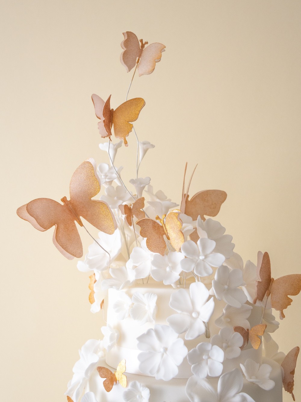 A modern four tier wedding cake, finished in smooth white fondant and adorned with a cascade of handcrafted blossoms. Delicate edible wafer paper butterflies in white and warm golden tones add the graceful lightness and flow the couple wished for. Presented at the Hortus Botanicus in Amsterdam.