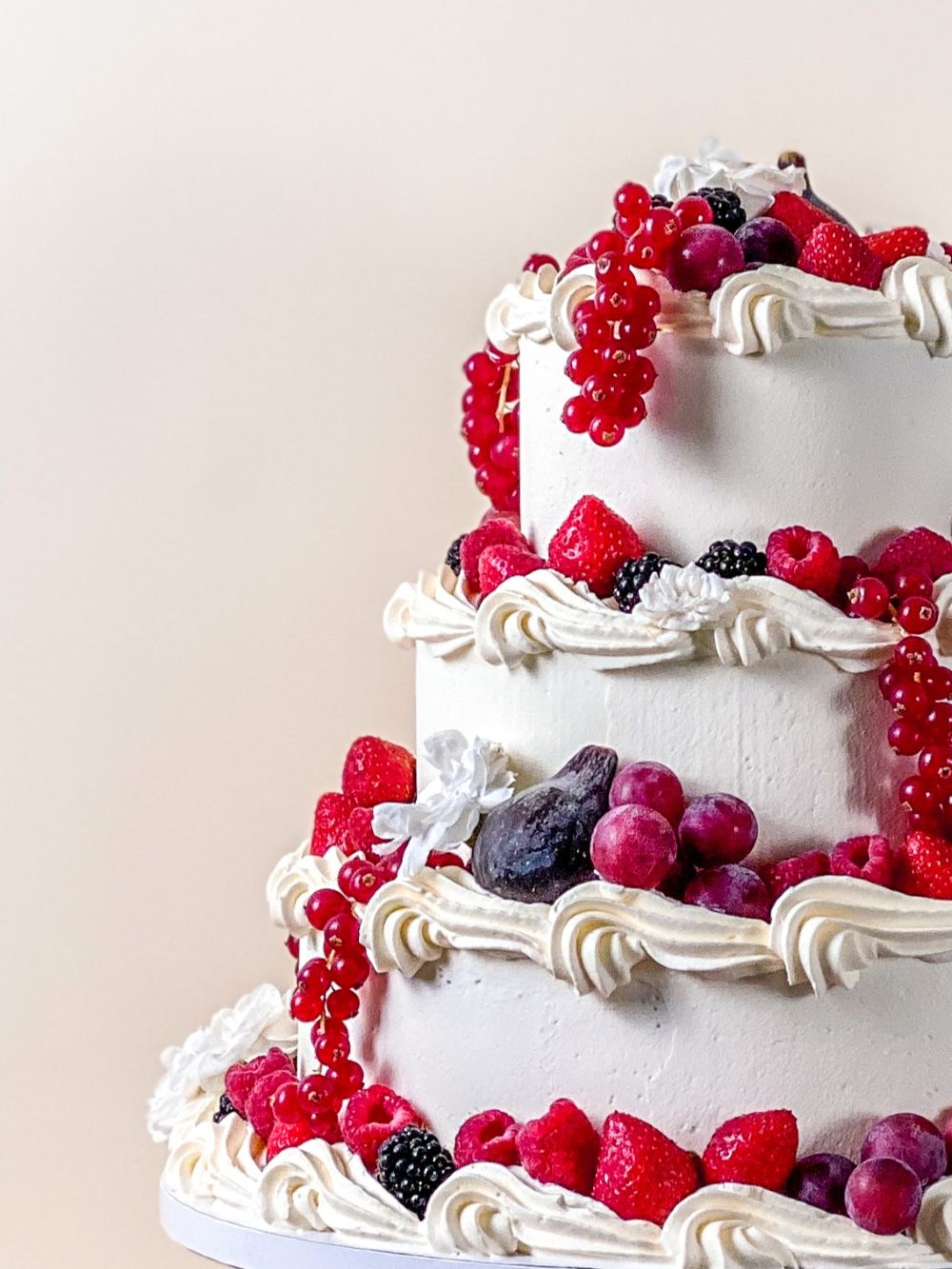 This classic three tier cake was created to celebrate a 25th wedding anniversary. Finished in smooth Italian meringue buttercream and dressed with the season’s finest fruit, it is pure indulgence. Generous piped vanilla swirls frame each tier, while ripe strawberries, raspberries, blackberries, figs and cascading redcurrants create a lush, abundant finish, dotted with delicate white edible blossoms.