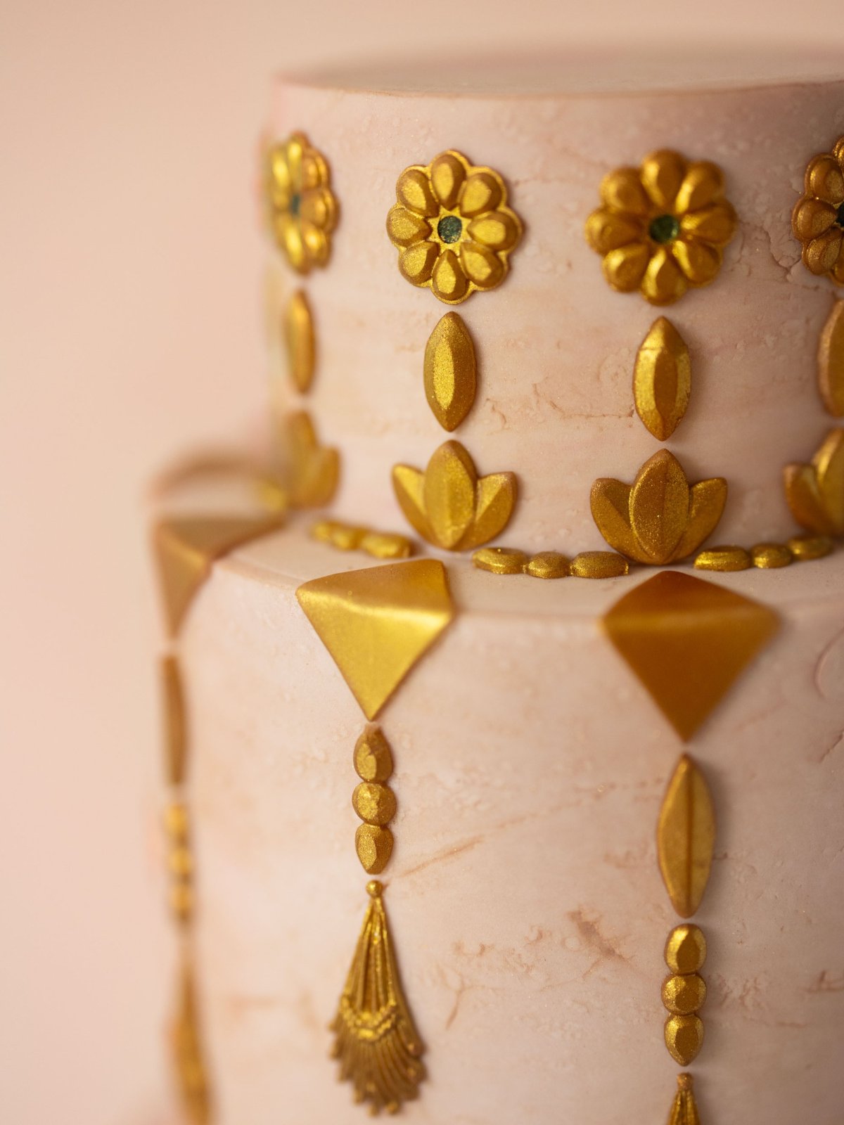 This 6-tier wedding cake is a beautiful blend of Moroccan tile artistry and intricate golden jewelry design. The textured stone-like surface contrasts with the delicate, handcrafted roses that elegantly trail across the tiers, embodying the charm of Arabic design.