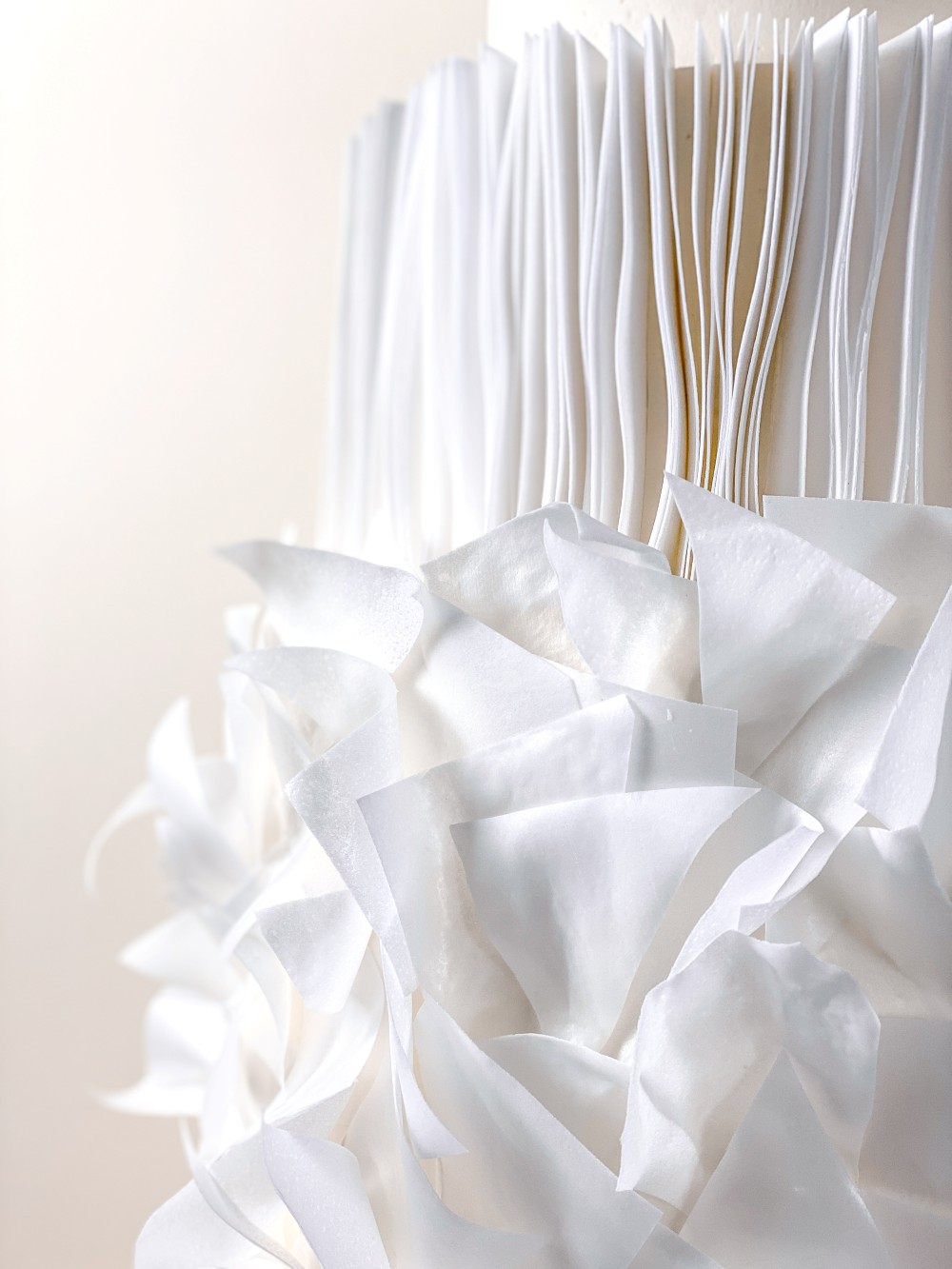 A modern, sculptural cake design with an effortlessly elegant presence. Smooth white tiers are paired with an architectural collar of fine pleats, then softened by a sweeping arrangement of hand shaped edible wafer paper folds that create a light, floating movement around the base. Designed to catch the light from every angle, this piece feels airy, contemporary, and quietly dramatic.