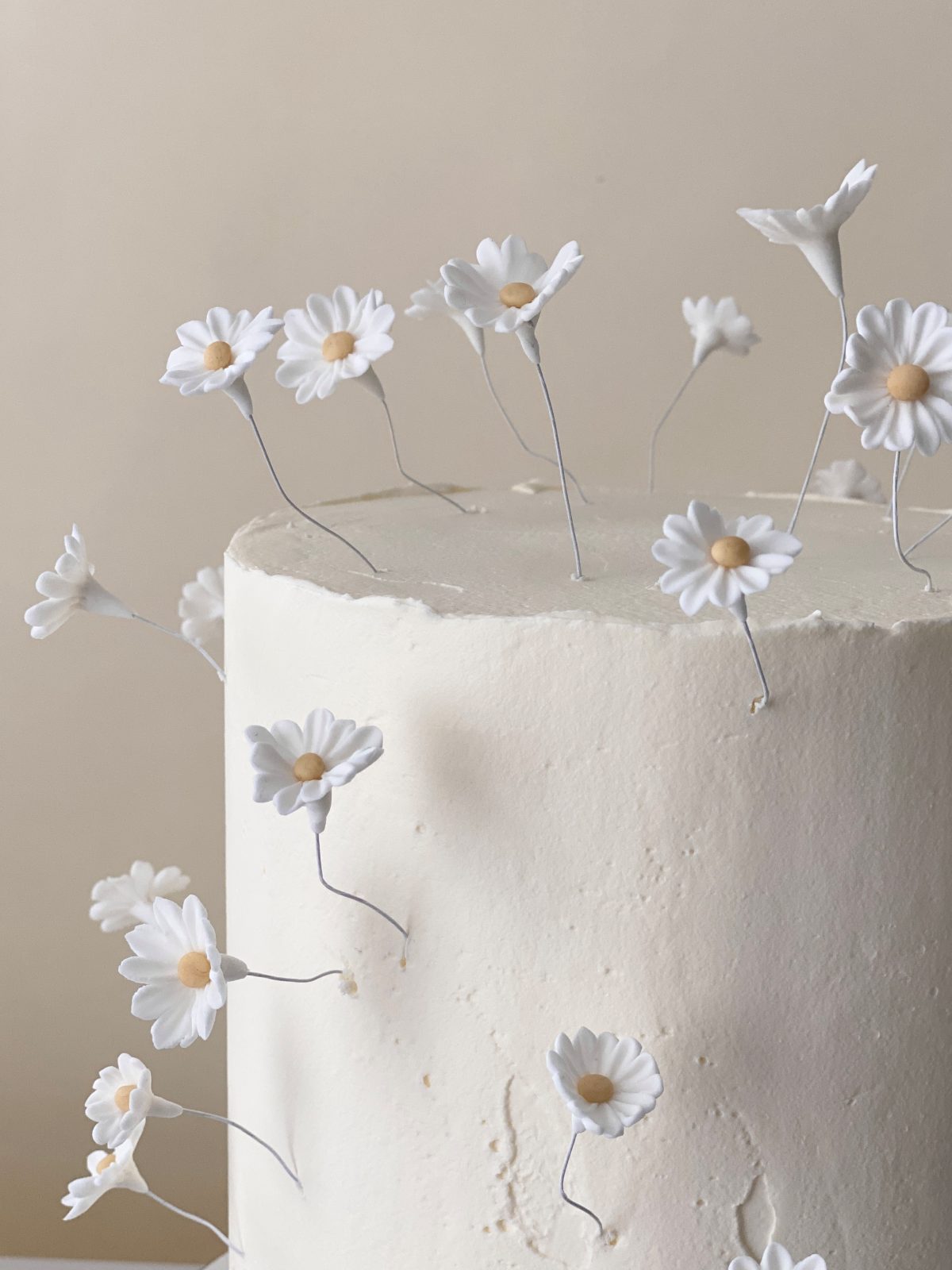 A stunning tall wedding cake that inspires a fantasie. This natural design is finished with a textured coat of Italian meringue buttercream and elegantly adorned with delicate handcrafted sugar daisies.